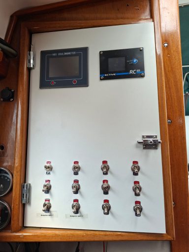 Alle wichtigen elektrischen Leitungen, Schaltpaneel, Anzeigen für Stromüberwachung (Input, Output, Ladezustand der Batterien) neu in 2025.