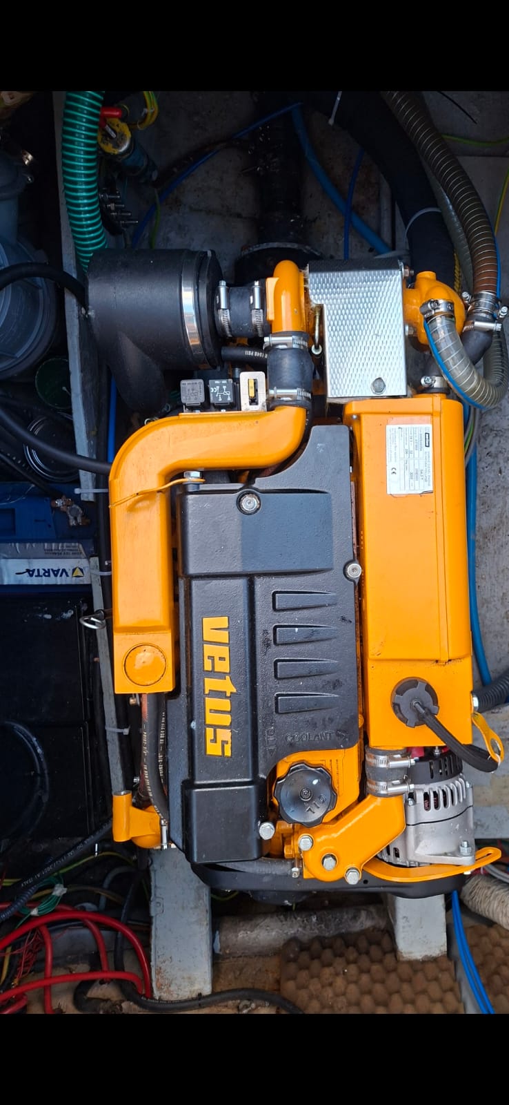 Neuer Dieselmotor in 2025 von Vetus, 52 PS Turbo, neues Getriebe, 5 Jahre weltweite Garantie bis Juli 2030 (übertragbar auf neuen Eigentümer), neue Bullflexkupplung, neuer Wassersammler und Schalldämpfer, Vorfilter mit Wasserabscheider, integrierte Ölabsaugpumpe, elektr. Dieselpumpe, zusätzlicher zweiter Kühlwasseralarm bei Überhitzung in der Abgasleitung, z. Zt. 520 Betriebsstunden, alle Inspektionen durch Fachbetriebe durchgeführt, Dreiblattfestpropeller (im Tunnel geschützt), Wellenlager wurden vom Vorbesitzer getauscht, 2 Dieseltanks (ca. 250 l ges.) plus 10 Reservekanister á 20 l an Deck festgelascht, Verbrauch 2,1 bis 2,2 l / h bei 1.500 U und 6-7 Kn Reisegeschwindigkeit (8 bis 9 Tage durchgehende Fahrt unter Maschine bzw. ca. 1.100 sm Reichweite unter Maschine.